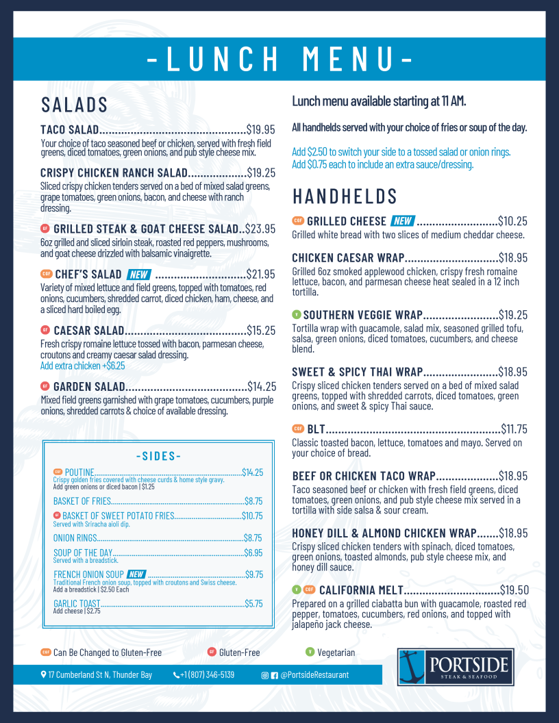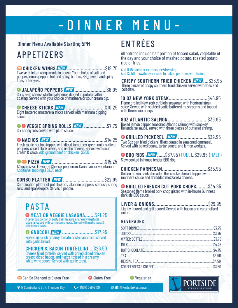Portside Steak and Seafood offers a straightforward menu that focuses on comforting, familiar dishes designed to suit a relaxed dining experience. Whether you’re stopping in for a casual lunch or unwinding over dinner and drinks, the menu caters to those moments when good food and comfortable surroundings matter most.